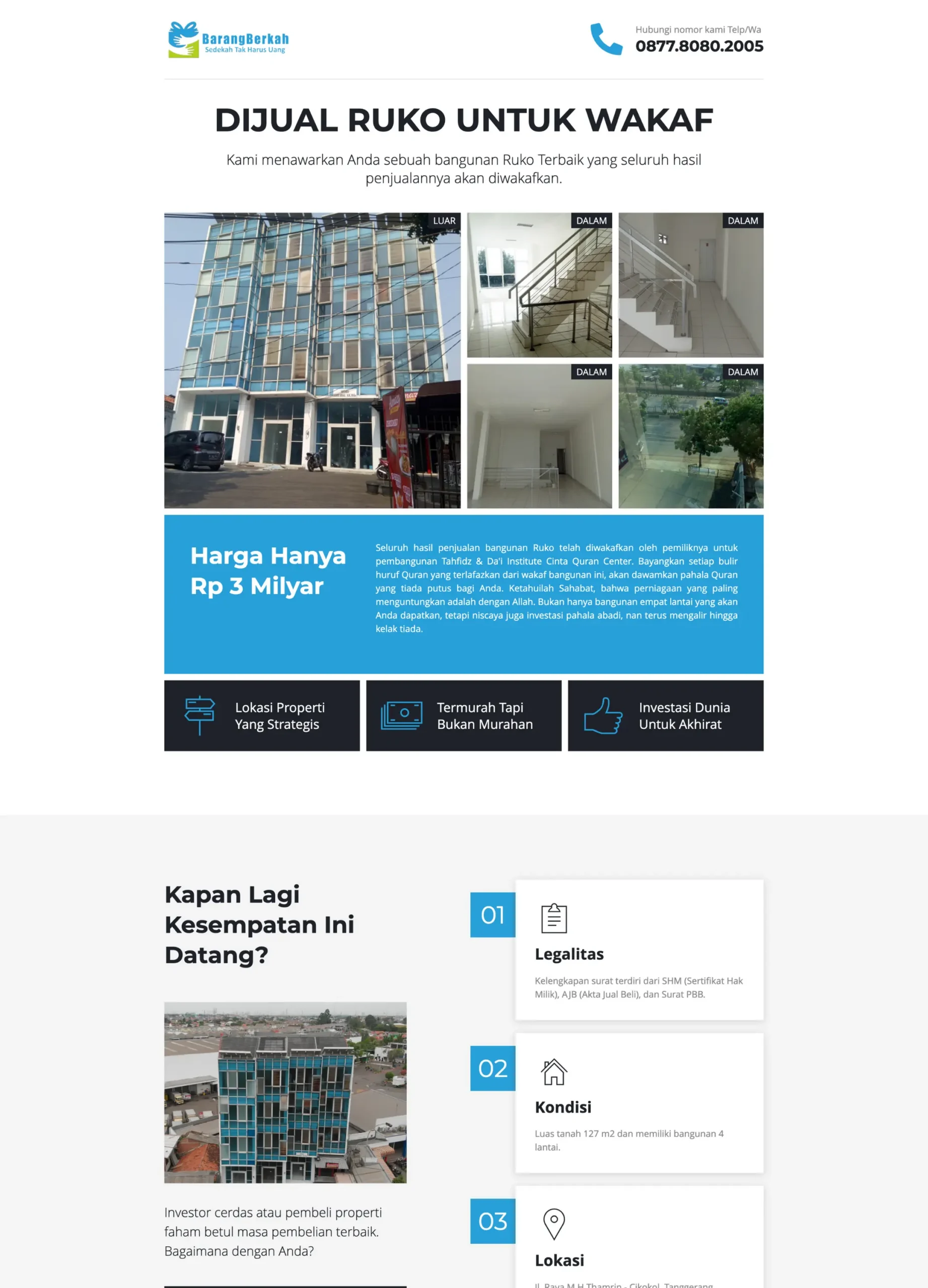 Landing page Barang Berkah, jual ruko wakaf, hasilnya untuk pembangunan gedung program Indonesia bisa baca Qur’an.