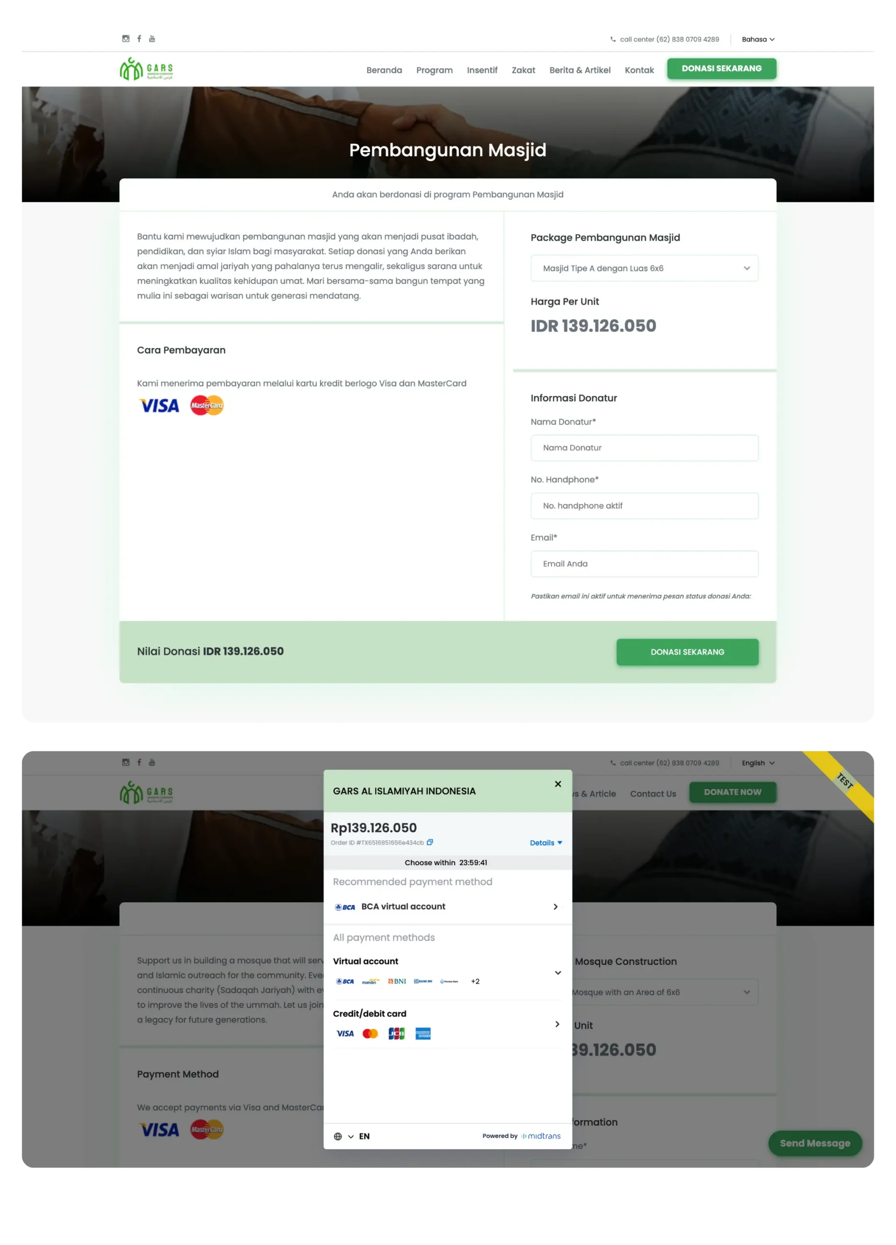 Portal donasi multibahasa untuk donatur di Middle East, terintegrasi dengan Midtrans.